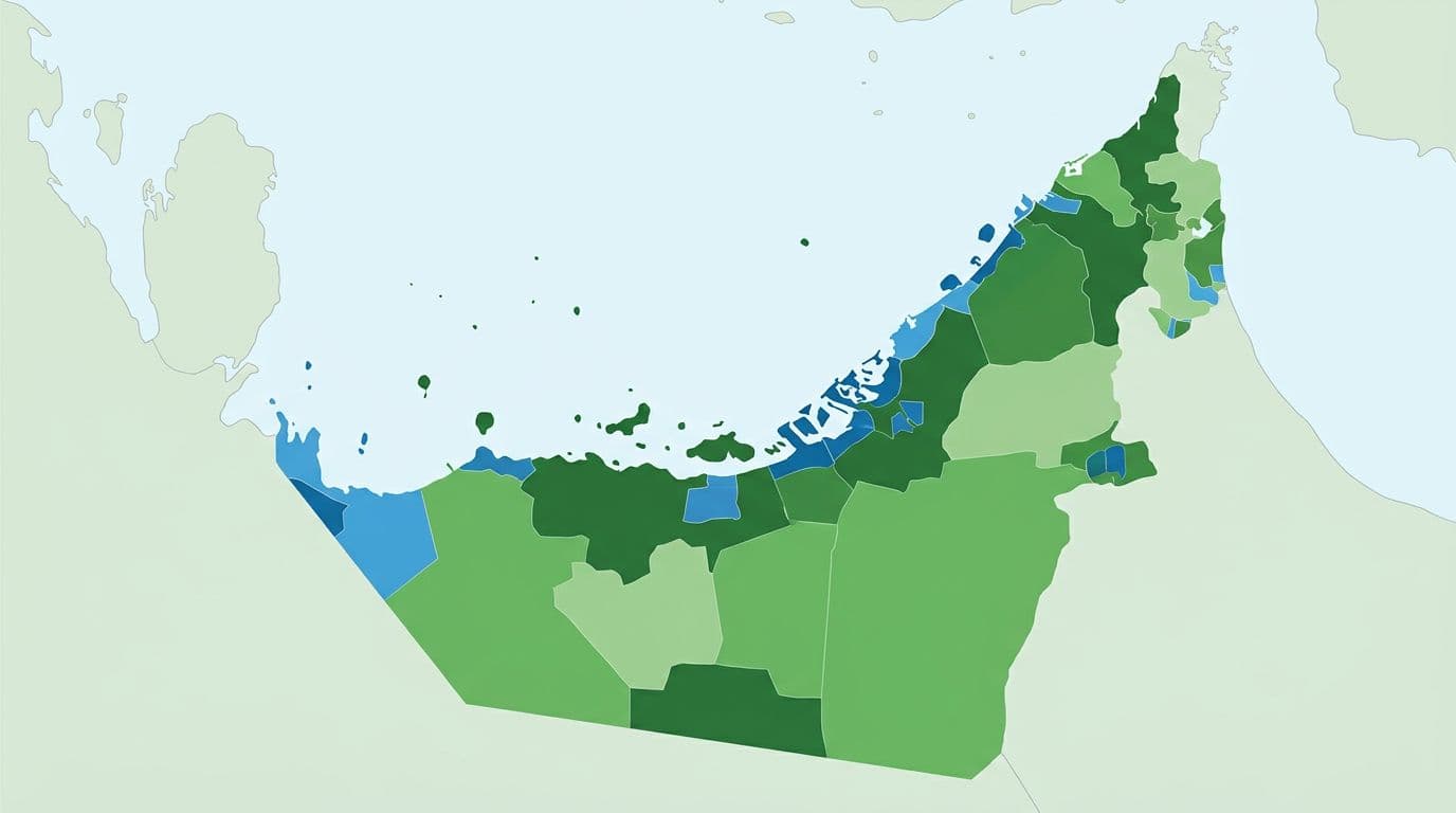 Illustrative map of the UAE highlighting free zones in blue tones and mainland areas in green tones, featuring a simple flat design with an aerial view and clear boundaries between zones like Dubai free zones and Abu Dhabi mainland. An illustrative view of UAE areas often associated with free zones versus mainland activity